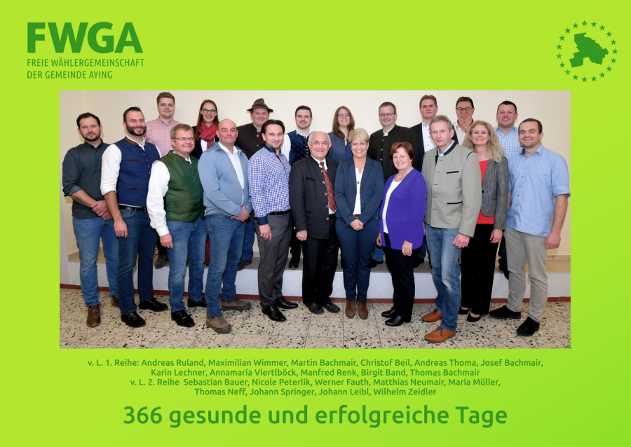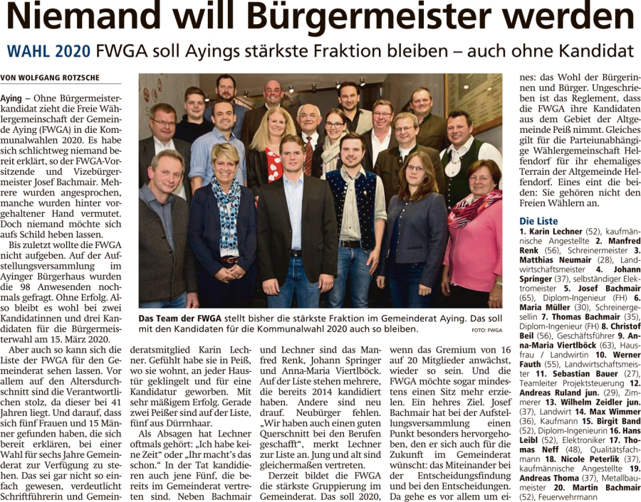 Bei der öffentlichen Aufstellungsversammlung am Montag, 25. November 2019, um 19.30 Uhr im Ayinger Bürgerhaus wurden die Kandidaten in folgender Reihenfolge gewählt: