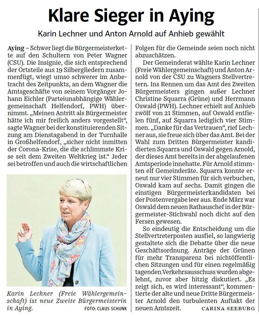 Die FWGA stellt mit Karin Lechner die 2. Bürgermeisterin ab 01.05.2020.